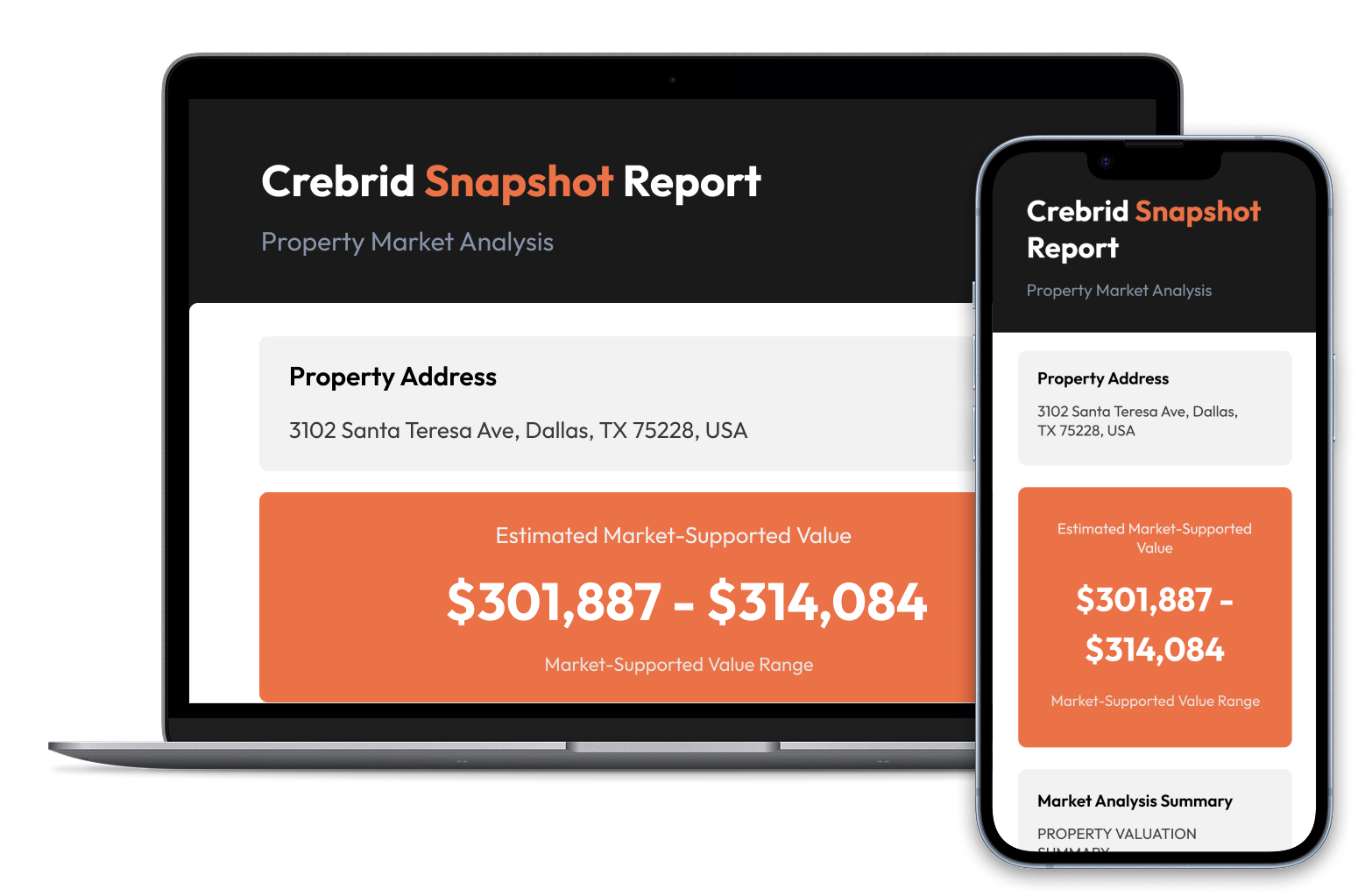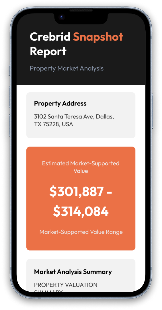 Your report includes an estimated value range supported by the current market, comparable sales data, and a market analysis summary—delivered in minutes, no account required.